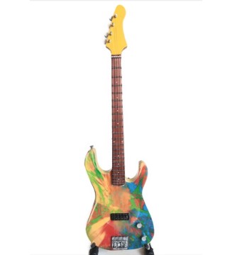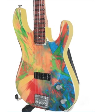Guitare miniature de collection de 25cm de haut. Cette guitare miniature est la réplique à l'échelle 1/4 de la guitare basse du bassiste du groupe californien Red Hot Chili Pepper's. Elle est le résultat de la collaboration entre Flea et le designer Damien Hirst. Cette basse sera facilement reconnaissable grâce à ses couleurs vives. Le bassiste des Red Hot est à l'aise dans les styles aussi variés que le Rock ou le Funk. Il est reconnu comme un artiste doué tant en studio que sur scène où il est connu pour sauter fréquemment, d'où son surnom de Flea (puce en anglais).