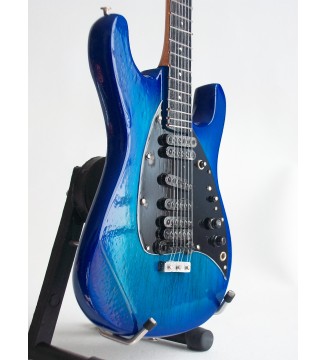 Guitare miniature de collection de 25cm, réplique de la guitare originale avec laquelle Steve Morse débuta sa collaboration avec la marque de guitares Music Man en 1986. Steve Morse est connu pour avoir été le guitariste du groupe Deep Purple de 1995 à 2022 en remplacement de Ritchie Blackmore, mais il joue également dans son autre groupe Steve Morse Band. Cette guitare présente la particularité de posséder pas moins de 4 micros, ce qui offre la possibilité d'obtenir onze sons différents. Sur scène, Steve Morse reste donc concentré sur le choix de la configuration de ses micros avec attention.