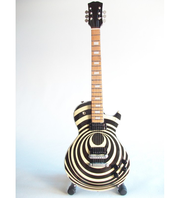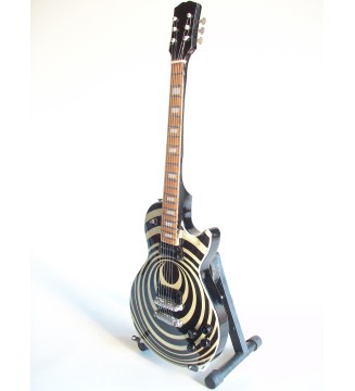 Guitare miniature de collection de 25cm, réplique de la guitare conçue pour le guitariste Zakk Wylde en 2012. La guitare miniature reproduit fidèlement le dessin dérivé de la fameuse Les Paul Bullseye. Les guitares de Zakk Wylde sont facilement reconnaissables grâce à leur look original. Ces guitares aux sonorités clairement Heavy metal sont déclinées en diverses formes dont plusieurs marques fabriquent des variantes. Zakk Wylde multiplie les projets artistiques en solo ou en tant que guitaristes de divers groupes. Son jeu puissant et inventif font de lui une référence guitaristique dans le milieu du Heavy Metal.