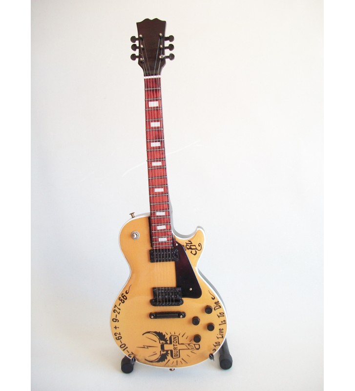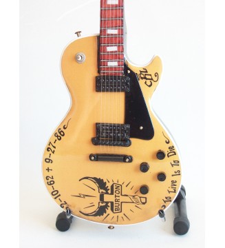 Guitare miniature de collection de 25cm, réplique de la guitare Les Paul réalisée pour rendre hommage au second bassiste de Metallica disparu dans un accident de la route lors d'une tournée du groupe en 1986. Apprécié pour ses qualités de bassiste talentueux, Clifford Burton a été victime d'un accident dans un autobus lors d'une tournée de Metallica en Suède. James Hetfield rend hommage à son compagnon de route en faisant réaliser cette guitare sur laquelle sont inscrit ses dates ainsi qu'un dessin agrémenté de l'inscription RIP.